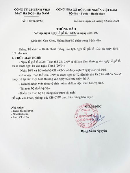 THÔNG BÁO LỊCH LÀM VIỆC NGÀY GIỖ TỔ HÙNG VƯƠNG VÀ NGÀY 30/4 - 1/5 17/04/2024 Chia sẻ bài viết: Tin liên quan Thư mời chào giá vật tư y tế năm 2024 Bệnh Viện Mắt Hà Nội - Hà Nam mời chào giá gói thầu thẩm định mua sắm Thủy tinh thể nhân tạo năm 2024 - 2025 GIẢI BÓNG ĐÁ HÀ NAM – NAM ĐỊNH CHÀO MỪNG KỶ NIỆM NGÀY GIẢI PHÓNG MIỀN NAM, THỐNG NHẤT ĐẤT NƯỚC 30/4 VÀ QUỐC TẾ LAO ĐỘNG 01/05