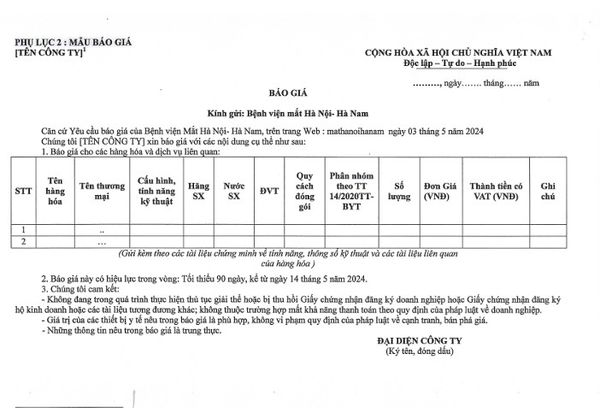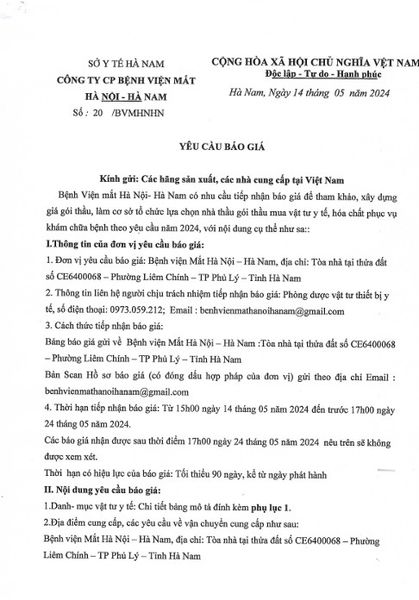 Thư mời chào giá vật tư y tế năm 2024 14/05/2024 Chia sẻ bài viết: Tin liên quan Bệnh Viện Mắt Hà Nội - Hà Nam mời chào giá gói thầu thẩm định mua sắm Thủy tinh thể nhân tạo năm 2024 - 2025 THÔNG BÁO LỊCH LÀM VIỆC NGÀY GIỖ TỔ HÙNG VƯƠNG VÀ NGÀY 30/4 - 1/5 GIẢI BÓNG ĐÁ HÀ NAM – NAM ĐỊNH CHÀO MỪNG KỶ NIỆM NGÀY GIẢI PHÓNG MIỀN NAM, THỐNG NHẤT ĐẤT NƯỚC 30/4 VÀ QUỐC TẾ LAO ĐỘNG 01/05